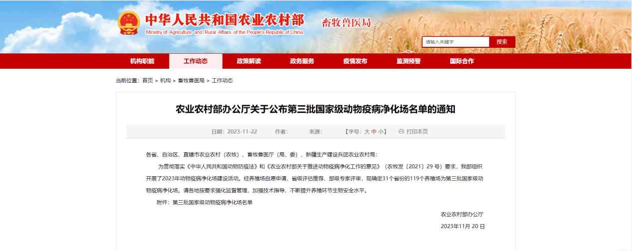11月20日,農業農村部辦公廳發布第三批國家級動物疫病凈化場名單(農辦牧﹝2023﹞29號),我司經部級專家評審,被評為國家級羊布魯氏菌病(非免疫)凈化場。